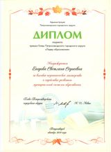 | Сведения о профессиональной переподготовке | 2011 год - профессиональная переподготовка по программе "Менеджмент организации" на факультете повышения квалификации Федерального государственного бюджетного образовательного учреждения высшего профессионального образования "Петрозаводский государственный университет" |